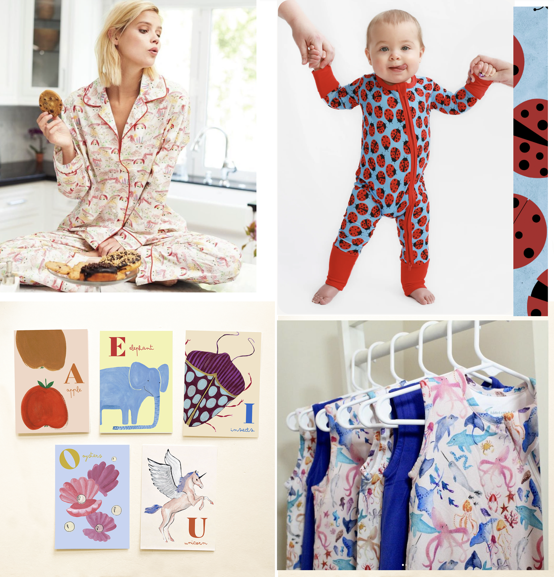 I love to create playful and bold watercolor illustrations of quirky characters and motifs— perfect for children’s fashion, home textiles and stationery.
